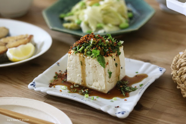 涼拌豆腐不想盤底出一灘水的話,除了把豆腐用紙巾吸乾水,就是醬汁要上桌前才淋上。